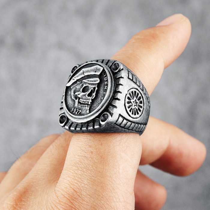Grosse chevalière homme acier biker tête de mort liberty 1927