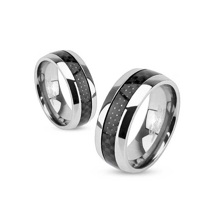 Ring mit einem zentralen Carbonfaserband mit schwarzem Hintergrund und kleinen interkalierten weißen Graupunkten, die dem Ring ein unerwartetes Design verleihen.