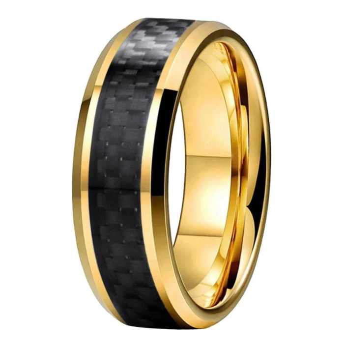 Bague homme acier placage or sertie et bande fibre de carbone argent