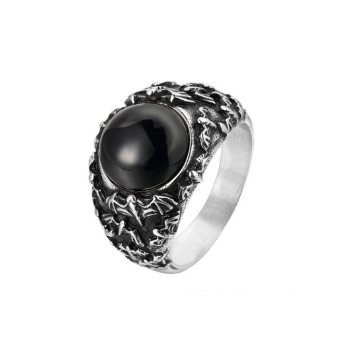 Découvrez cette superbe bague gothique pour homme conçue en acier inoxydable est ornée d'une magnifique pierre noire qui prend une place prépondérante. Des chauve-souris en relief habillent ce petit bijou et sort du cadre pour donner une touche d'originalité tant attendue. Les détails sont absolument superbes et confèrent toute son animosité à ce petit bijou de qualité. L'intérieur de la bague est complètement lisse, donc épouse le doigt parfaitement avec sensation.