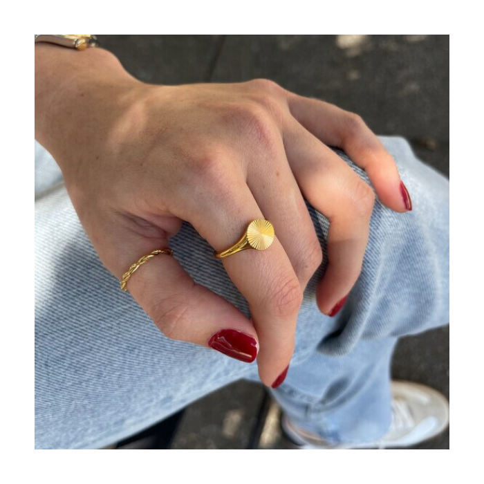 Découvrez cette merveilleuse bague soleil pour femme conçue en acier inoxydable dorée à l'or fin, rappelant un motif de rayon de soleil. Un beau rappel de la lumière que chacun de nous porte en nous, ce design intemporel sera assurément une pièce précieuse pour les années à venir. Le plateau de cette chevalière or pour femme mesure 9mm x 10 mm. Concernant l'anneau, lui a une largeur de 3 mm.