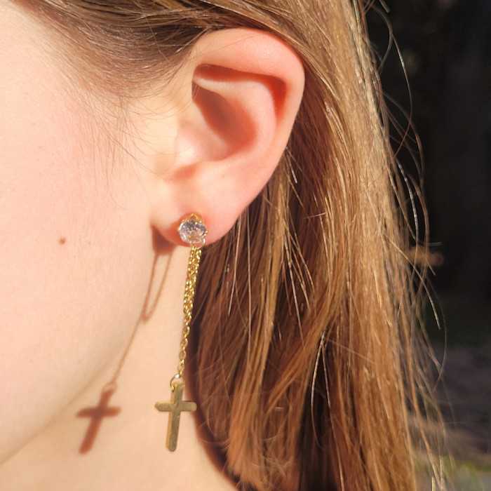 Découvrez ces merveilleuses boucles d'oreilles femme conçues en acier inoxydable doré à l'or fin disposant d'une croix. Une chainette est reliée du zirconium au pendentif croix et une seconde chaînette est suspendue au zircon au fermoir, ce qui donne aux boucles d'oreilles élégance et mouvement. L'élément principal de ces boucles d'oreilles originales est la croix qui pend au bout de la chaîne. Ces élégantes boucles d'oreilles femme avec croix seront un excellent moyen de mettre en valeur votre style et votre religion, elles vous embelliront à coup sûr.