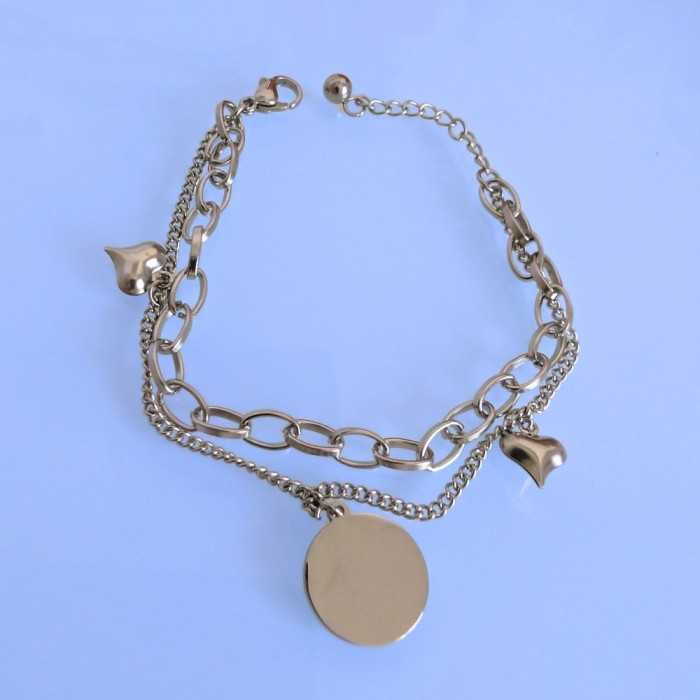 Hommebijoux vous présente ce ravissant bracelet féminin en acier inoxydable caractérisé par une double chaîne agrémentée de deux breloques en forme de coeur se balançant doucement et d'une médaille avec possibilité de personnalisation sur les deux faces pour rendre ce bracelet encore plus unique.