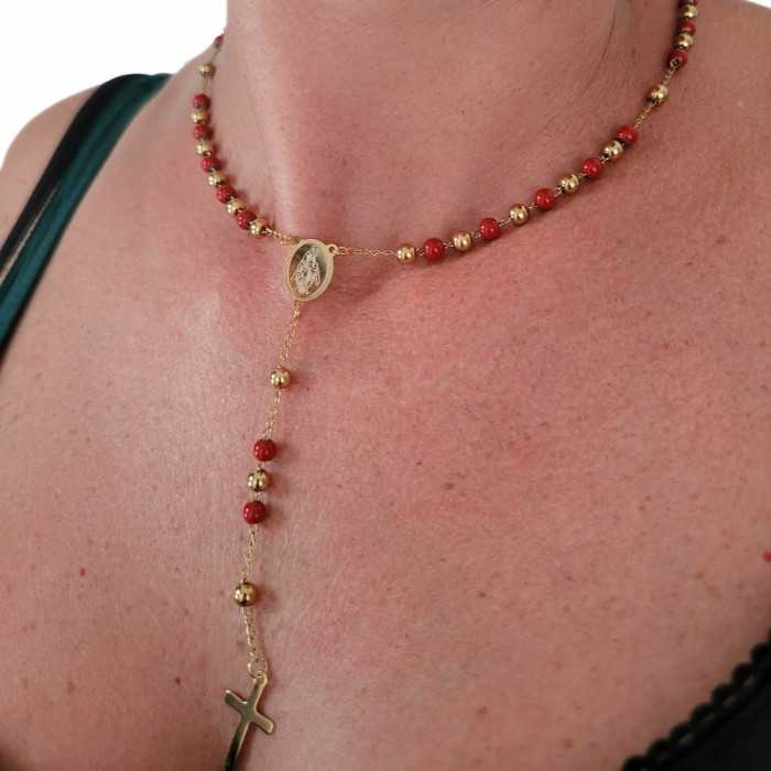 Adoptez ce chapelet femme catholique en acier inoxydable doré composé en alternance de perles rouges et dorées agrémenté d'une médaille représentant la dame de guadalupe nom donné à la vierge marie pour exprimer votre gratitude envers votre seigneur et vous protégez des problèmes néfastes.