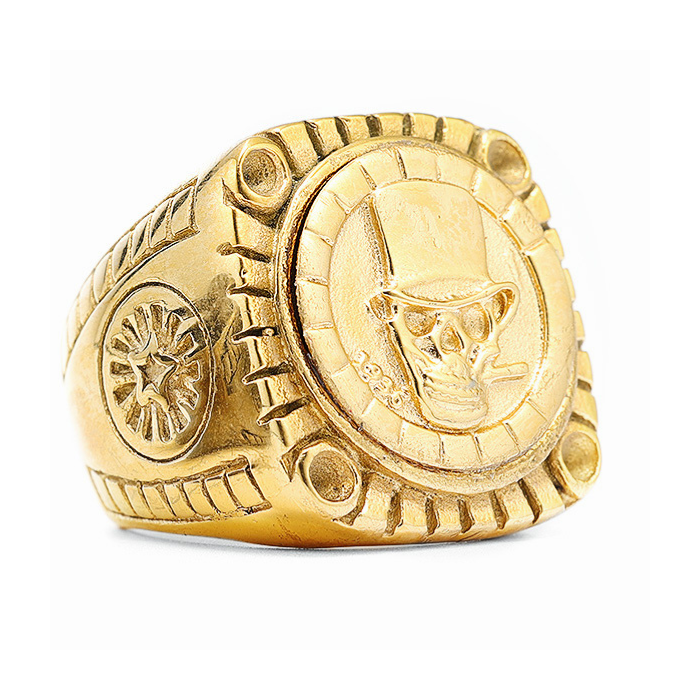 Bague chevalière homme acier doré tête de mort style mexicaine biker