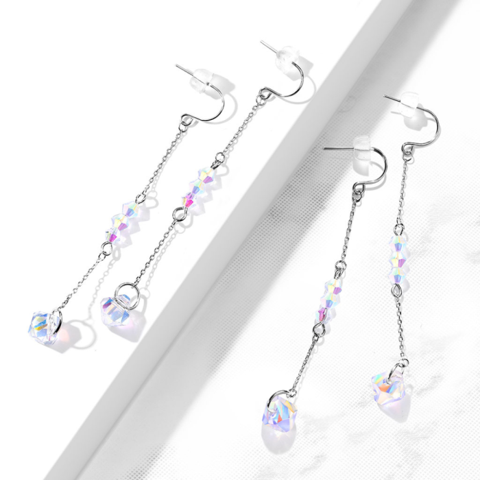 Découvrez ces merveilleuses boucles d'oreilles pendantes en acier inoxydable disposant d'une chaîne reliant une cascade de perles irisées en forme de losange pour rehausser votre élégance et allonger votre cou. La couleur irisée est une couleur proche de celle de l'arc-en-ciel, qui brille de reflets colorés. Raffinées et élégantes, ces boucles d'oreilles vous embelliront à coup sûr. Ces boucles d'oreilles sont munies d'un fermoir crochet sécurisé qui se fixe d'un simple geste.