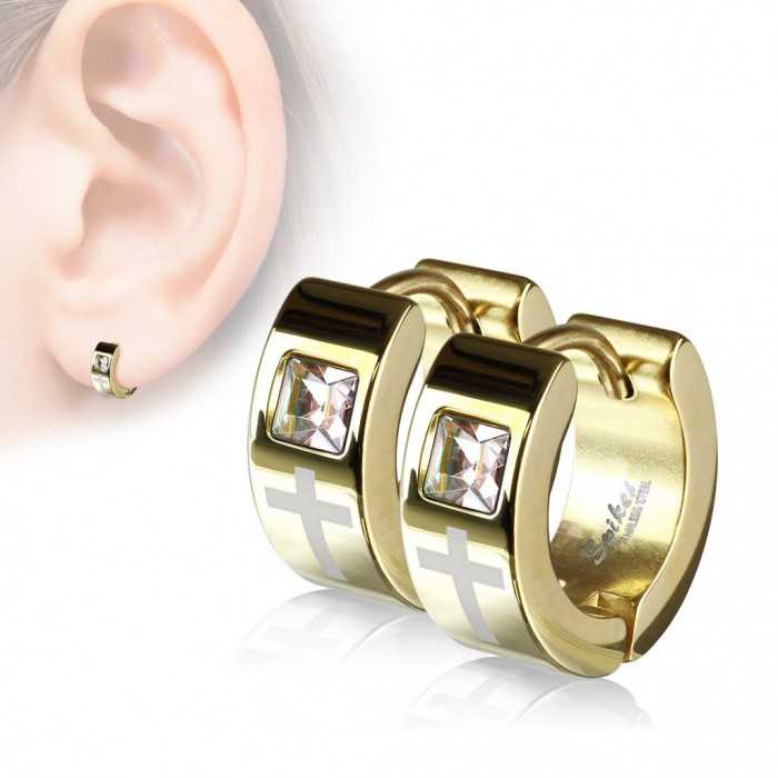 Déclinez en 3 couleurs cette paire de boucles d'oreilles créoles en acier inoxydable a tout pour séduire. En effet, ces créoles sont ornées d'une croix gravée blanche au laser ainsi que d'une pierre carrée blanche insérée dans l'acier. Une tige, légèrement arquée, relie les deux anneaux épais, segmentés en deux. Elles se ferment par simple pression des doigts sur la tige ce qui facilite la pose et assure la fiabilité au bijou. Des boucles d'oreilles de grande qualité, très classes et originales proposées à un petit prix.