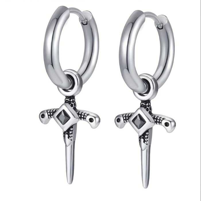 Si vous cherchez des boucles d'oreilles modernes, vous allez être séduits par ces créoles avec dague. Conçues en acier inoxydable de grande qualité et serties d'une pierre précieuse, ces créoles avec pendentif dague s'ouvrent grâce à un fermoir anneau, pour une fermeture sécurisée. A cette créole, un pendentif poignard est orné en son centre une pierre noire créant une allure particulièrement rock et gothique.