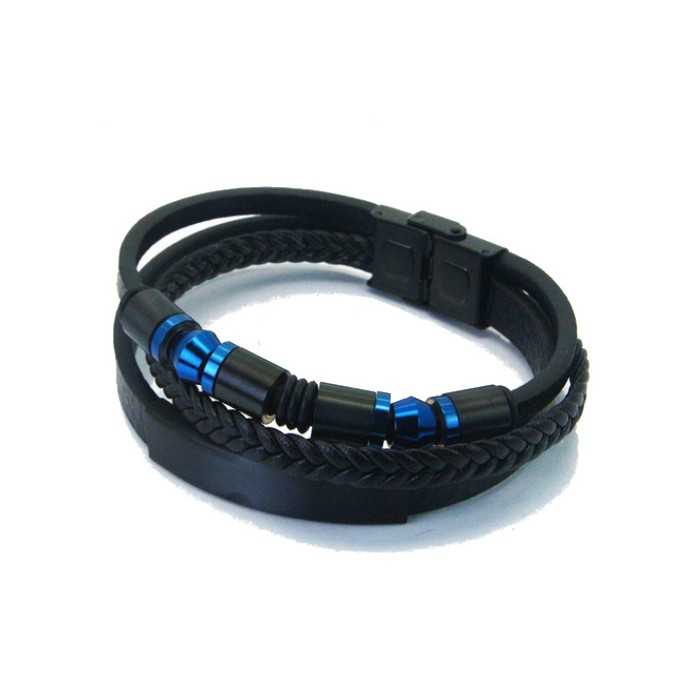 Ce bracelet en véritable cuir personnalisable possède une classe inégalée qui complétera à la perfection votre look masculin. Il est constitué de trois cordes tressées. Un cordon en tresse de cuir, d’un cordon plat large et pour finir un cordon plat sur lequel sont insérés une alternance de motifs cylindriques en acier inoxydable noir et bleu. L'ensemble des trois cordons sont maintenues par un solide fermoir aimanté en acier inoxydable. Un bracelet séduisant qui souligne la sensualité du geste de l'homme raffiné. Sa particularité ? Il est personnalisable : faites graver vos initiales, un mot ou une date spéciale pour créer un bracelet unique et significatif.