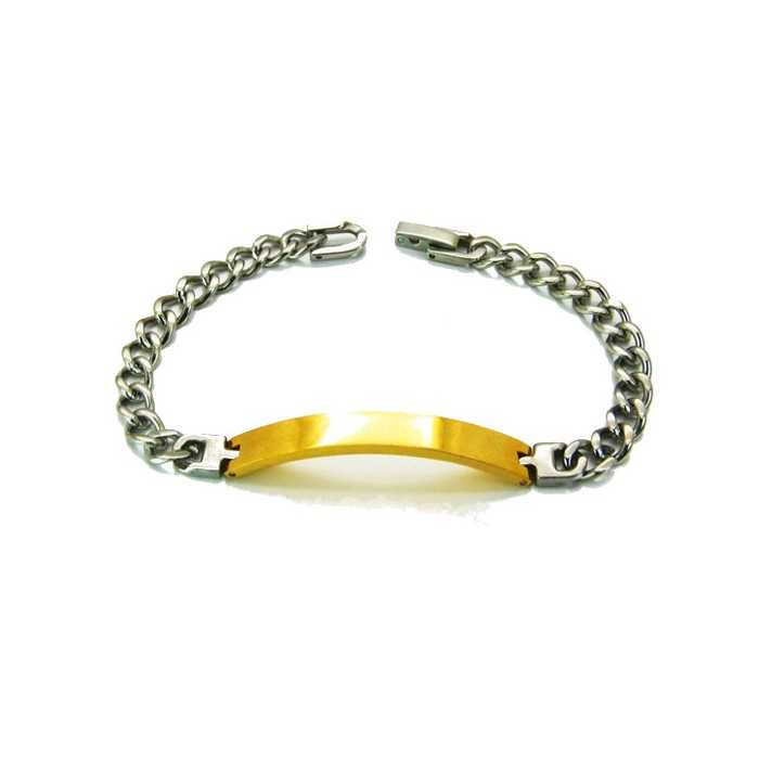 Voici un joli bracelet pour homme en acier inoxydable à maille cubaine avec une plaque doré à l'or fin à personnaliser.