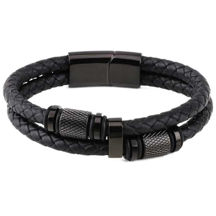 Voici un bracelet homme classe et moderne, composé de deux rangs en cuir naturel possédant des ornements cylindriques en acier inoxydable assemblés sur un robuste fermoir à glissière aimanté en acier noir. Les cordons noirs doux s'adapteront à tous les tons de peau.