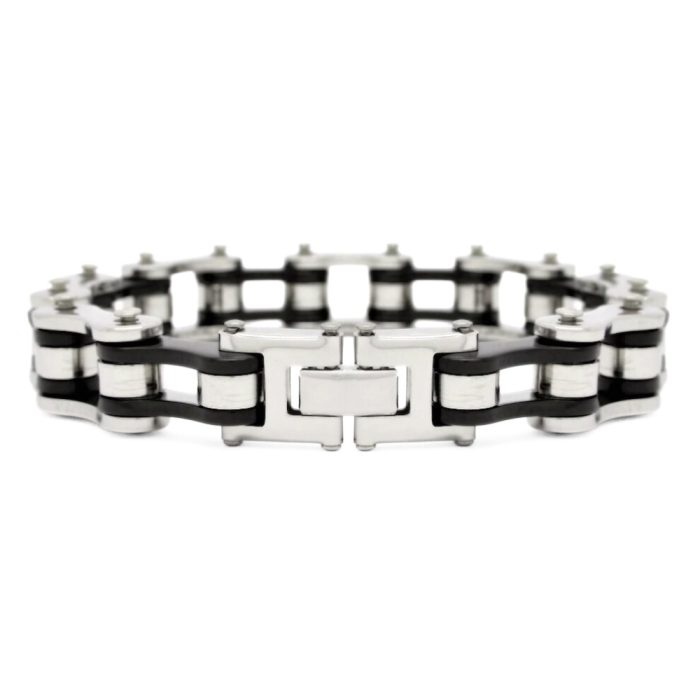 Vous êtes un passionné de motos et vous souhaitez embellir votre poignet, alors vous serez comblés avec ce bracelet pour motard noir et argent composé de maillons comparable à une chaîne de moto ou de vélo qui respire l'assurance et la puissance. Il sublimera assurément votre virilité avec élégance, vous ne passerez pas inaperçu.