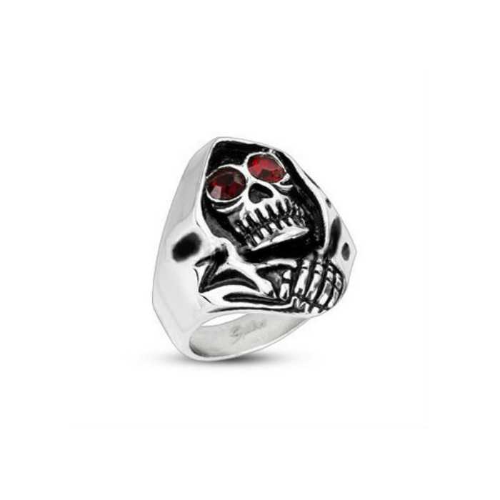 Découvrez cette bague unique représentant le personnage reaper (la grande faucheuse). Deux zircons rouges sang ornent de leur brillance les orbites de ce crâne inquiétant. Effroyable au possible, cette bague plaira aux amateurs de tête de mort ou gothique. L'intérieur de la bague est complètement lisse, donc épouse le doigt parfaitement avec sensation.