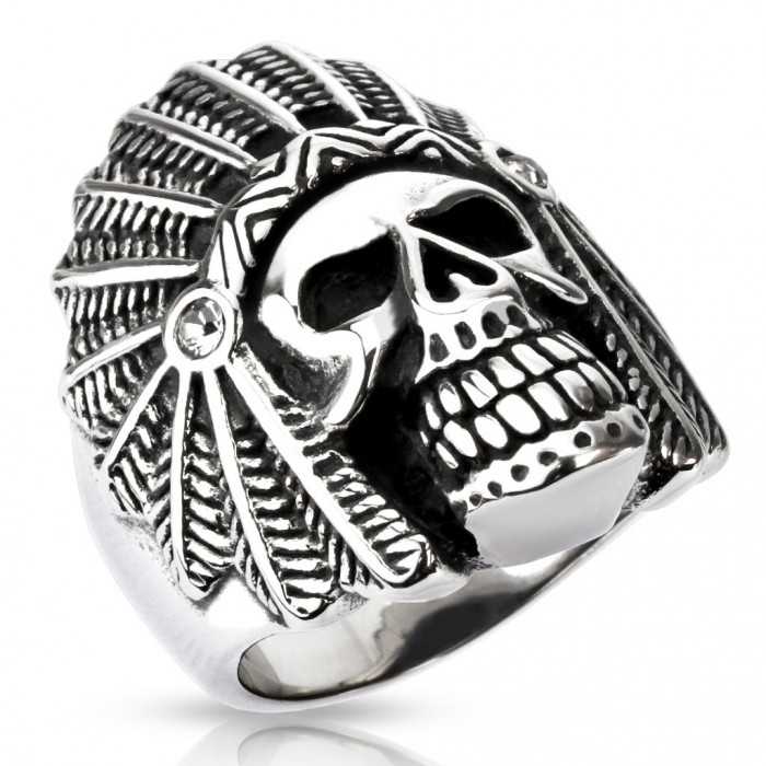 Une bague tête de mort apache en acier inoxydable haut de gamme couronné de sa coiffe de plumes. Ce chef apache est votre allié pour la fin des temps. L'acier de la bague va s'ancrer à votre doigt pour l'éternité.* rire démoniaque * L'intérieur de la bague est complètement lisse, donc épouse le doigt parfaitement avec sensation.