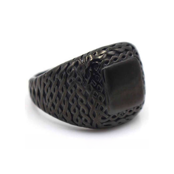 Découvrez cette élégante chevalière pour homme en acier inoxydable toute noire orné en son centre d'un cabochon noir sur sa face avant ainsi que de motifs tressés qui l'encadre.