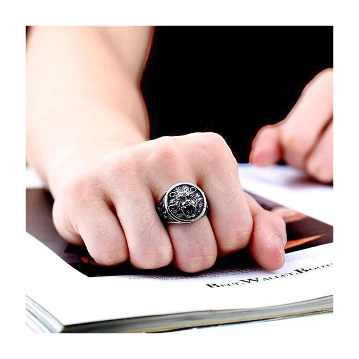 Bague homme acier massif tête de lion sculptée large crinière argent