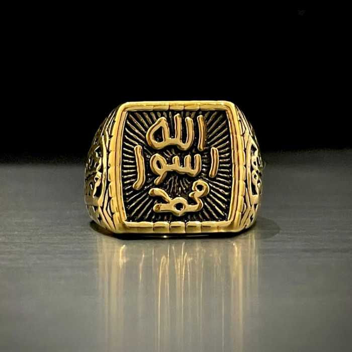 Déjate seducir por esto anillo allah, escrito en arabic allah profeta Mohamet lo que significa que Mohammed es el Mensajero de Dios. Este sello fue colonizado por el profeta Mohammad. El acero en este anillo estaba dorado y ennegrecido. El sello del profeta aparece en el centro en todo su esplendor. Esto islam recuerda los compromisos contraídos con la religión y su pareja, fortaleciendo así la fe y la conexión espiritual con Allah. Construido inteligentemente, este anillo disfruta de un alto nivel de acabado y material de calidad. El interior del anillo es completamente suave, así que encaja perfectamente con la sensación.