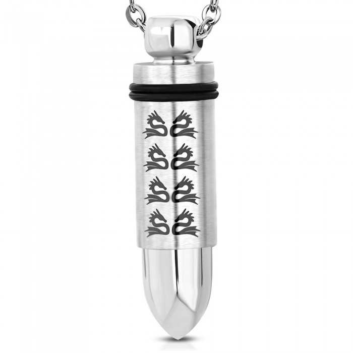 Superbe pendentif, en acier de haute qualité, en forme de balle finement décoré d'une frise à dragons en placage noir. La bélière fixe est soudée sur la douille.