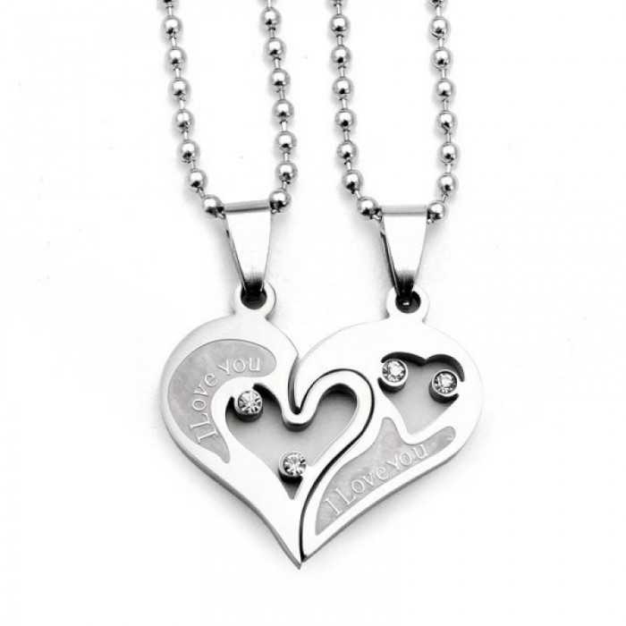 Pendentifs en forme de coeur se séparant en deux. Chaque pendentif est serti de 2 petits strass en oxyde de zirconium et chacun est gravé de l'inscription "I love you". Idéal pour couple amoureux (St Valentin, Anniversaire...). Un bijou mixte qui est vraiment unique en son genre.