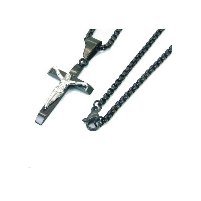 Pendentif Croix Homme et Chaîne Jésus Christ Crucifié en Acier Inoxydable Noir Pour Homme