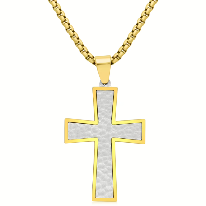 Collier pendentif homme et chaine incluse croix acier martelé or fin