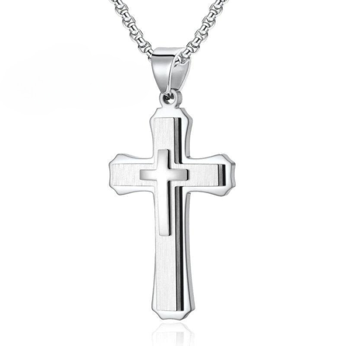Conçu en acier inoxydable, voici un merveilleux collier pendentif imposant dont trois croix sont superposées tout en relief pour un effet garanti. Le pendentif est accompagné de sa chaîne stylisée incluse déroulant un ruban de mailles écrasées en forme de grains de blé visible en photo.