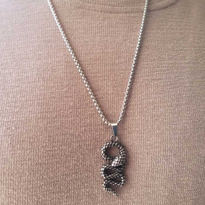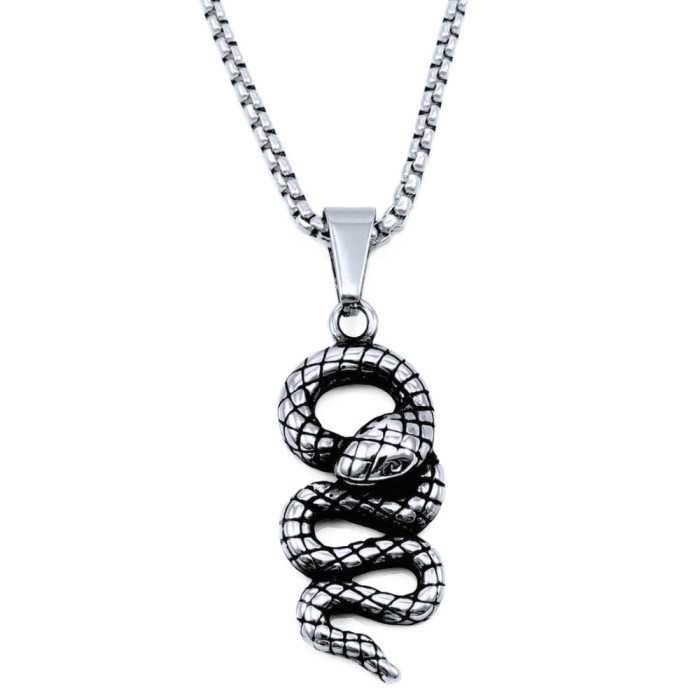 Voici un joli pendentif en forme de serpent en acier inoxydable accompagné de sa chaîne stylisée incluse déroulant un ruban de mailles écrasées en forme de grains de blé qui vous est présentée en photo. Sa longueur est de 60cm et sa largeur est de 3mm. Le côté sauvage et puissant du serpent est bien rehaussé par le style de ce collier serpent pour homme. Les détails réalistes du serpent sont envoutants et incroyables, montrant de manière vivante l'esprit et la férocité du serpent. La tête est définie de manière réaliste et l'aspect naturel des ressorts du corps est bien exécuté. Le design serpent incarne un charme intemporel et ajoute une touche de mystère à votre ensemble.
