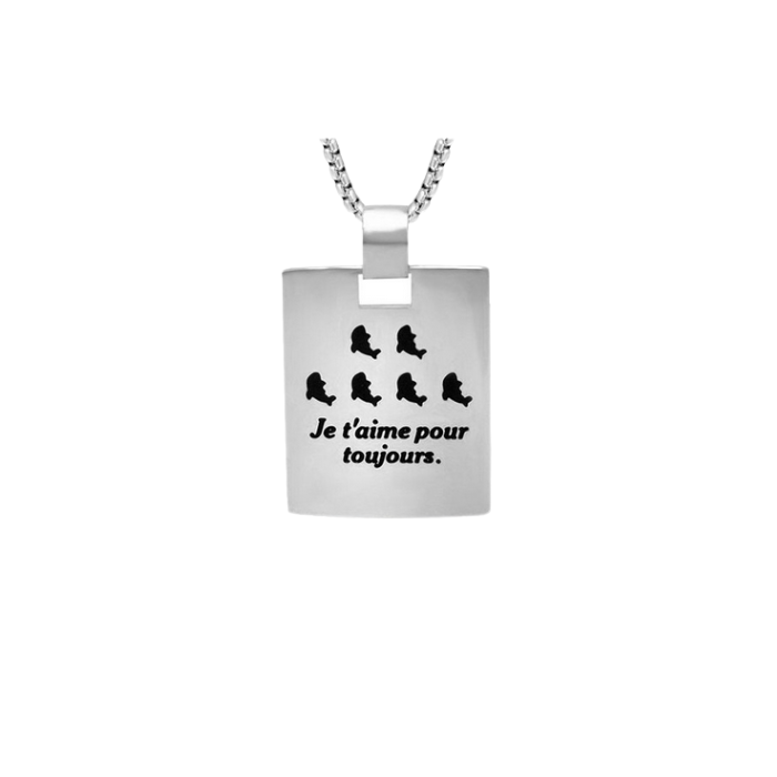 Großartige rechteckige Platte aus Edelstahl, auf der der Satz graviert wird "Ich liebe dich für immer." und sechs delfine. mit einer stilisierten kette inklusive.