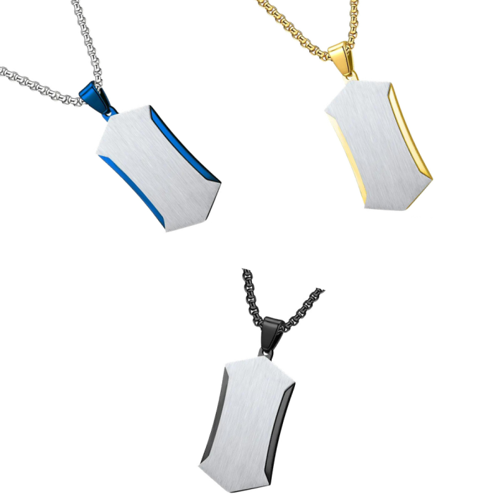 Hier ist ein männer anhänger halskette modern gemacht in edelstahl inspiriert von militärplatte von geometrische form und abgeschrägte kanten blaue farbe, schwarz oder gold. Es wird mit seiner stilvollen Kette präsentiert und verkauft.