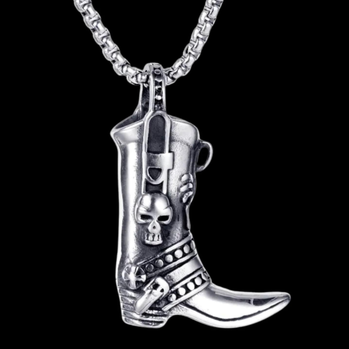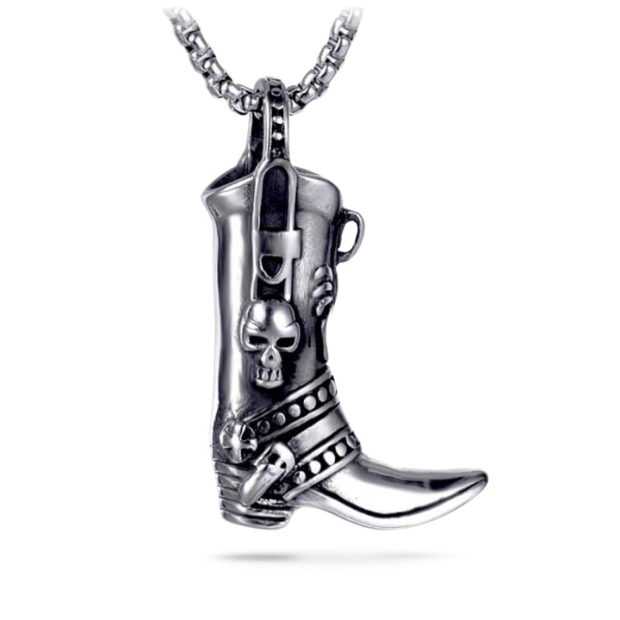 Hier ist ein original anhänger für männer entworfen in edelstahl bilden wunderschön ein cowboy-boot. Das anhängerboot perfekt kombiniert boot und schädel realistische details, ein herzhaftes und stilvolles aussehen. Der Anhänger wird begleitet von stilisierte kette inklusive.