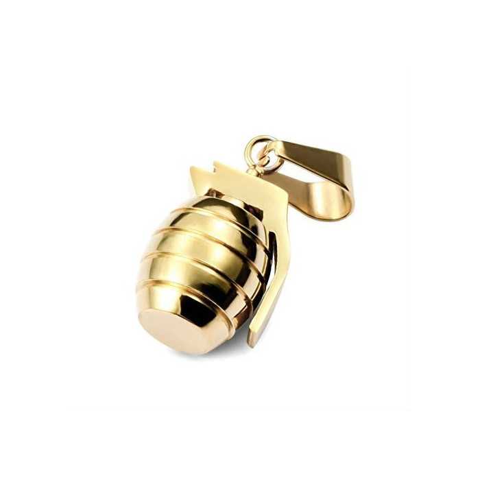 Diese horizontale Nut Hand Granate, aus Edelstahl mit einem goldenen Schatten. Sehr realistischer Anhänger mit seinem Sicherheitsstift mit perfekten Oberflächen, wird in einer dreieckigen mobilen Falte auf einen rutschigen Ring aufgehängt.