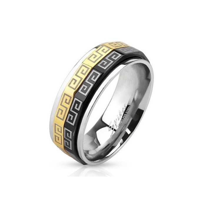 Herrenring aus Stahl mit schwarzen und goldenen Anti-Stress-Muttern und griechischen Motiven