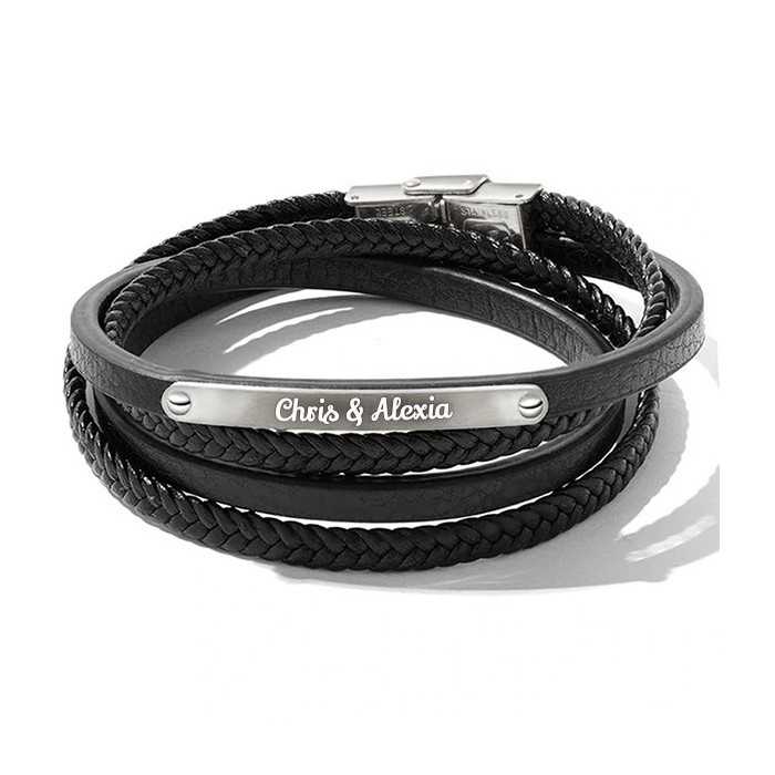 Echtes schwarzes mehrreihiges Stahllederarmband für Herren, Stahlplatte zur Personalisierung
