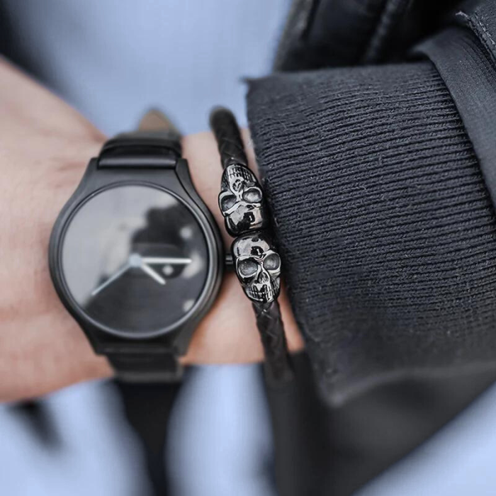 Hier ist ein klassisches und modernes Leder- und Stahlarmband mit zwei Totenschädeln mit einem Carnel-Lächeln, die die Essenz der Männlichkeit sind. Totenköpfe und schwarzes Leder... zeitlos, stilvoll, kühn!