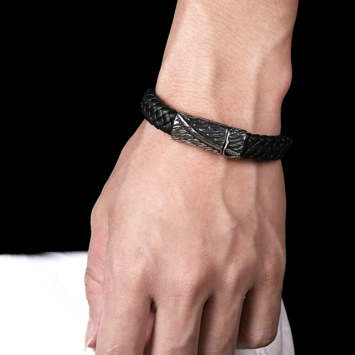 Wir präsentieren Ihnen modernes mann armband geflochten schwarzes leder präsentation ein schwert in relief auf einem verschluss edelstahl. Es hat eine magnetverschluss edelstahl anpassbar um es einzigartig zu machen.