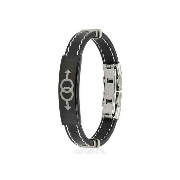 Magnificent verstellbares Armband für Männer in Silikon und Verschluss in schwarz plattiert Edelstahl mit einer Gravur von zwei Mann Symbole miteinander verbinden, symbolisieren Gewerkschaft und Stolz für ein Homosexuell Paar in Edelstahl. Dieses sehr elegante Schmuckstück ist mit einem soliden und sicheren Verschluss ausgestattet.