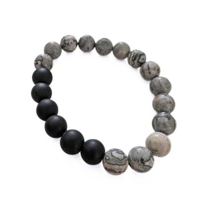 Herrenarmband graue Achatperlen und Mate Black Onyx-Perlen - 18 bis 20 cm