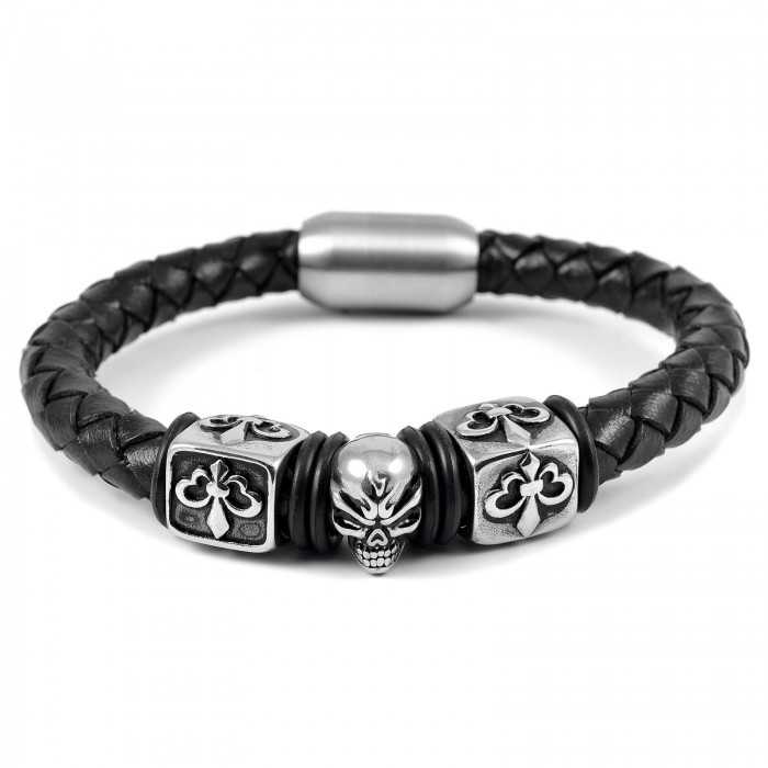 Herrenarmband aus Leder und Würfelschließe mit Totenkopf-Fleur-de-Lys-Stahl