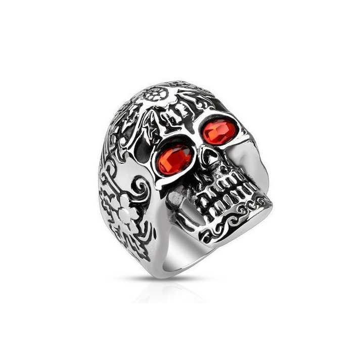 Ring repräsentiert einen Kopf des Todes mit roten Augen im Zirkon. Ein maskulines und trendiges Juwel ideal für einen virilen Mann. Die roten Augen, die Blumen und Stammesmotive krähen, um diesem Schädel Schönheit und Relief zu verleihen.