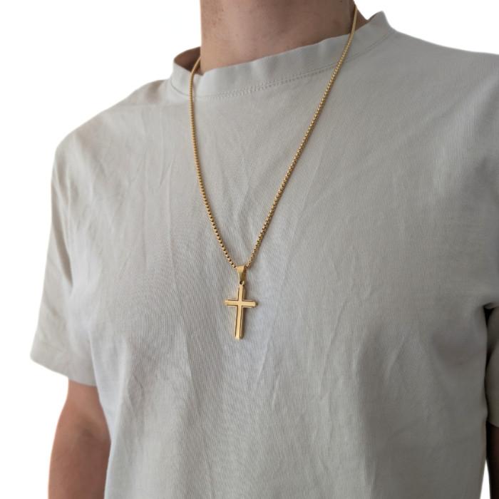 Herren Kreuz Anhänger Gold Stahl Kanten Schwarze Linie anpassbar - Weizenkorn Ketten enthalten