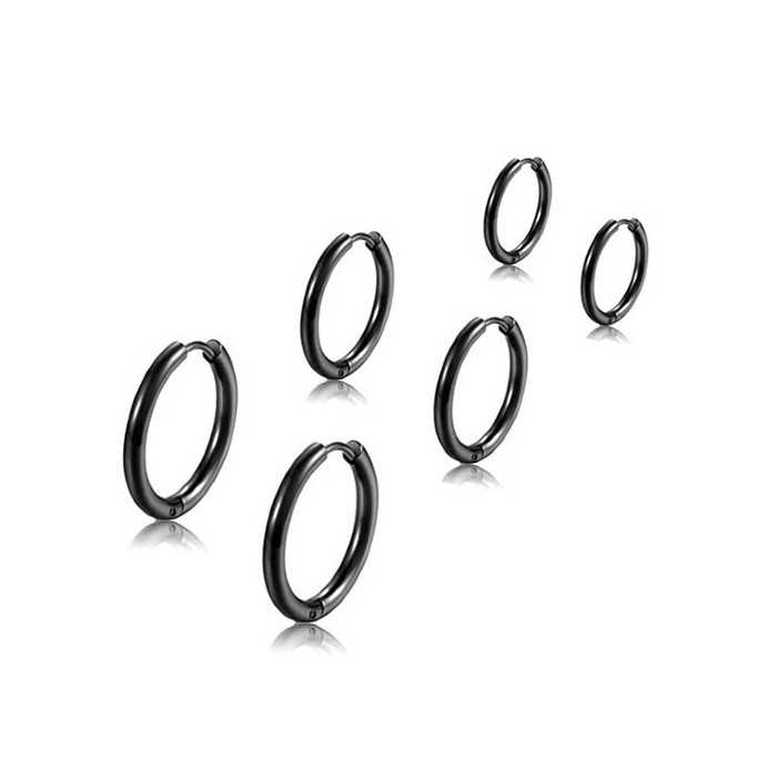 Entdecken Sie diese feinen Paar hochwertiger Edelstahl-Ohrringe, alle schwarz, erhältlich in verschiedenen Durchmesser. Ein Stiel, leicht gewölbt, verbindet die beiden dicken Ringe, unterteilt in zwei. Sie schließen durch einfachen Fingerdruck auf den Stiel, der es einfach zu posieren und sichert Zuverlässigkeit an den Schmuck. Saubere Ohrringe und kostengünstige Klassen.