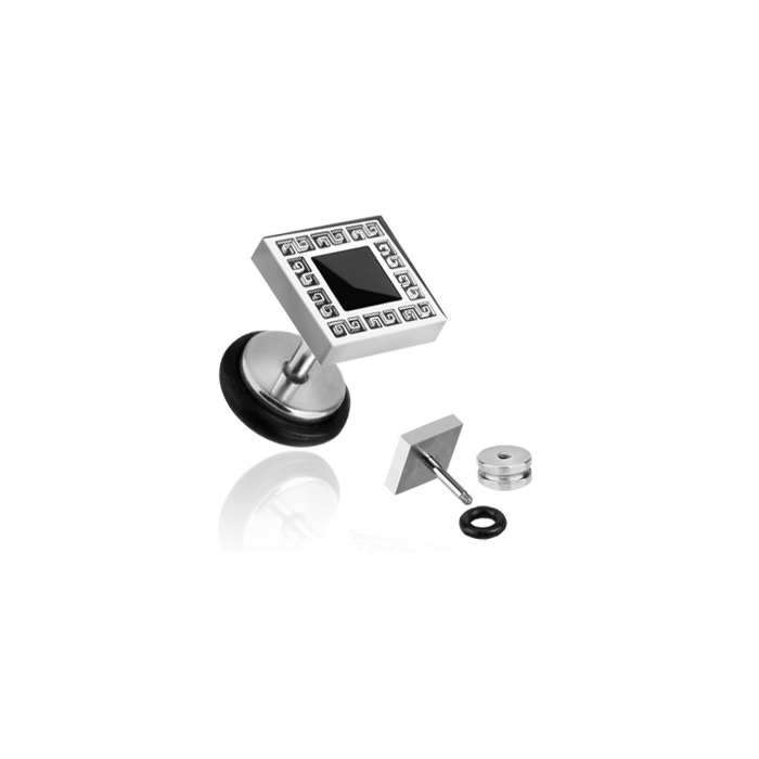 Paar Ohrringe (Fals Piercing) aus quadratischem Edelstahl, der durch Schraubsystem schließt. In der Mitte zeichnet sich ein Quadrat aus schwarz verziert Farbe und ein griechischer Fries zieht rundherum.