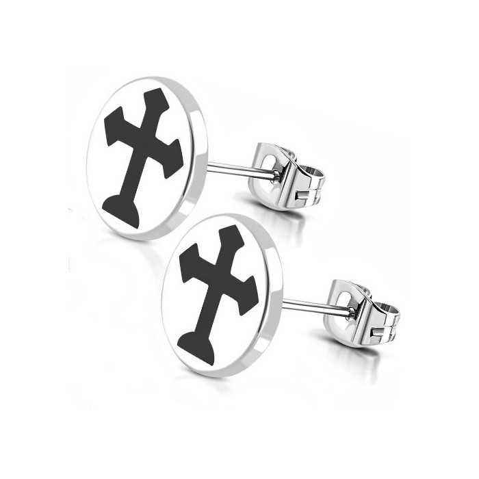 Paar hochwertige Ohrringe aus Edelstahl verziert, von einem schwarzen Furnier durch Ionisation, mit einem erhabenen mittelalterlichen Kreuz. Die Halterung des rechten Stiels wird durch eine Schmetterlingsbefestigung gesichert. Ein sehr klasse Schmuck zum kleinen Preis angeboten.