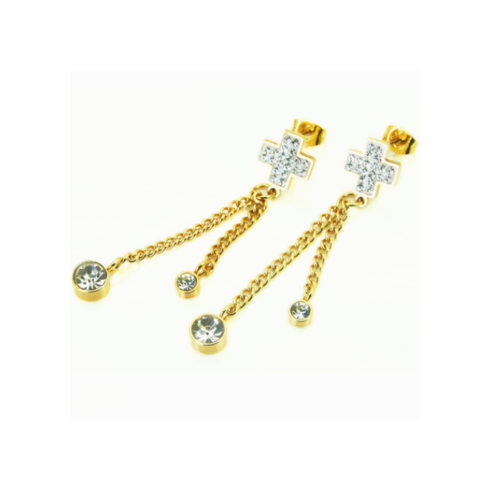Entdecken Sie diese wunderbaren Gold Gold Gold Gold Gold Gold Ohrringe mit zwei Ketten hängen an einem Kreuz mit einem Zirkon gepflastert. Hervorgehoben und elegant, diese Ohrringe werden Sie sicherlich verschönern. Diese Ohrringe sind mit einem sicheren Schmetterlingsverschluss ausgestattet, der eine einfache Geste repariert.