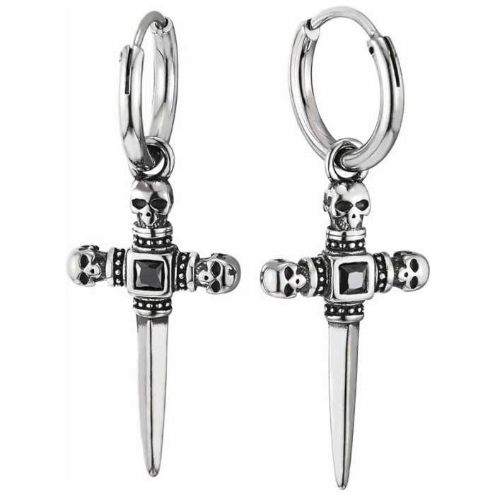 Wenn Sie suchen kraftvolle ohrringe und modern, werden sie von diesen verführt todeskopfohrringe von kreidetyp. Entwickelt in hochwertigem Edelstahl, diese kreolen mit schwert anhänger kopf des todes eröffnung dank einer ringverschluss, für einen sicheren verschluss. Zu diesem Creole, a schwert anhänger ist mit drei totenköpfen mit einem schwarzen stein in der mitte verziert, wodurch eine besonders felsoptik entsteht.