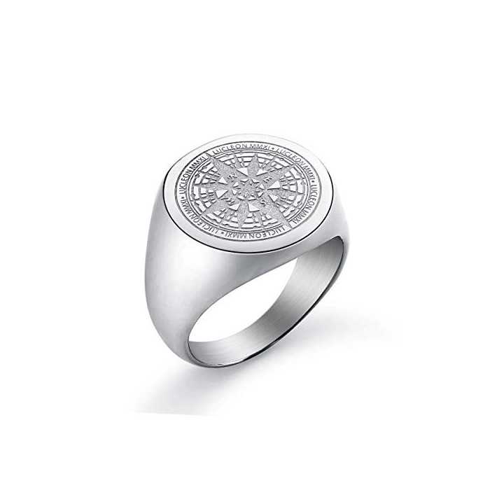 Ritterring verziert mit einem sternförmigen Kompass, bekannt als eine Rose der Winde auf gebürstetem Edelstahl graviert. Ein perfekter Look für moderne Abenteurer. Dieser Ritter führt Sie während Ihrer Reise. Die Innenseite des Ringes ist völlig glatt, so heiraten Sie den Finger perfekt mit Empfindung.