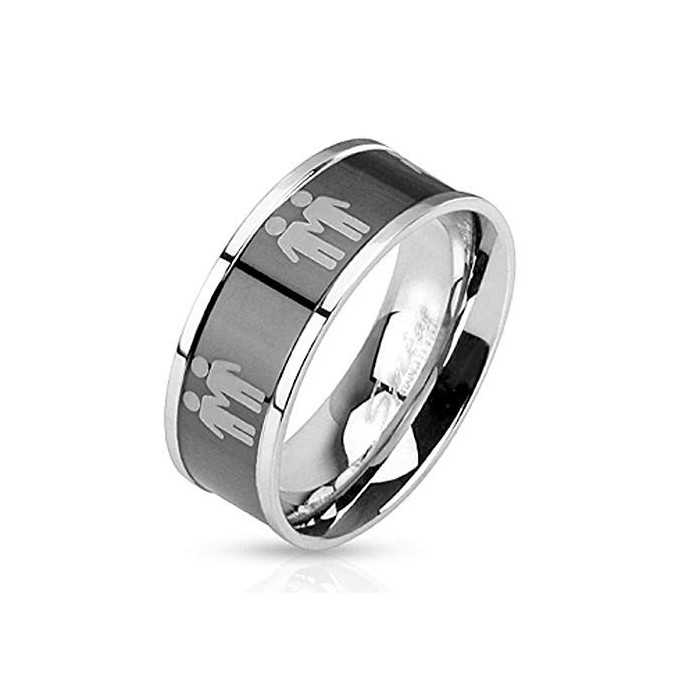 Stahlring und schwarz durch Ionisation plattiert. Auf der Mittelleiste werden zwei Männer nacheinander gezogen, die ihre Hand halten. Ein starkes Symbol der Vereinigung zwischen zwei Männern, dieser Ring bringt Ihnen Stolz. Eine ideale Allianz für einen schwulen Frieden oder eine Ehe zu bieten.