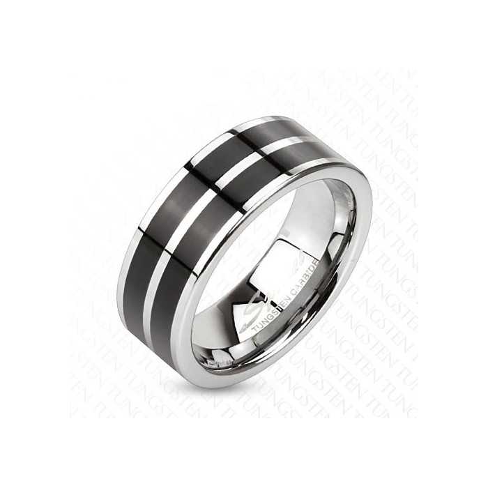 Wunderschöne Männer Ring in High-End Wolfram mit 2 schwarzen Streifen schwarz plattiert, was die Schönheit dieses Ringes hervorhebt. Die Innenseite des Ringes ist völlig glatt, so heiraten Sie den Finger perfekt mit Empfindung.
