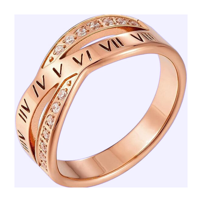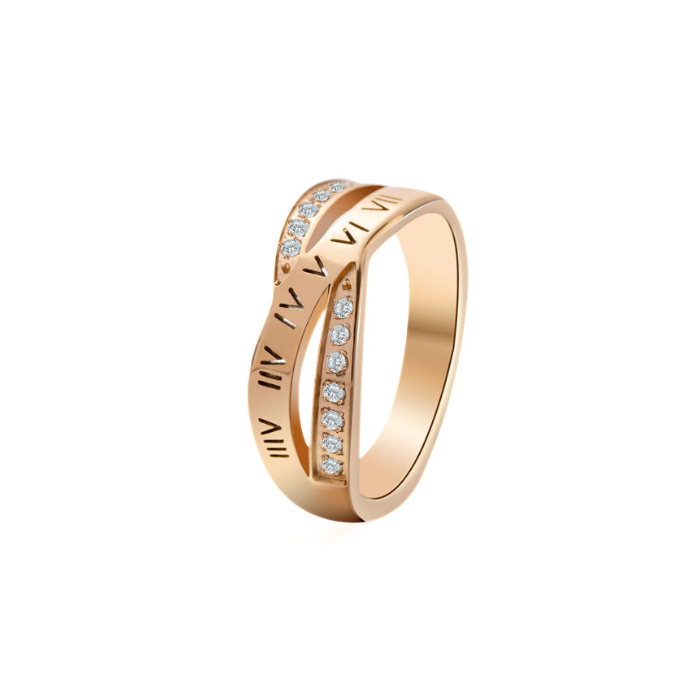 Damen-Ehering aus roségoldenem Stahl mit kreuzenden römischen Ziffern