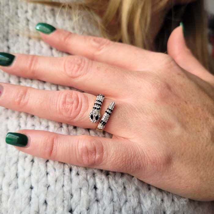Entdecken Sie dieses originelle und schöne schlangenring das wird sicherlich ihre handgelenk sublimieren. Ein original frauen ring mit einer dicke von mehr als 20 mm en vergoldeter edelstahl und mit funkelnden strasssteinen geschmückt, um es zu einem einzigartiger ring. Köstlich und raffiniert, dies schlangenring frau wird ihr handgelenk perfekt ankleiden und sie jeden tag begleiten und ihnen eine feminine und schicke note am finger garantieren.